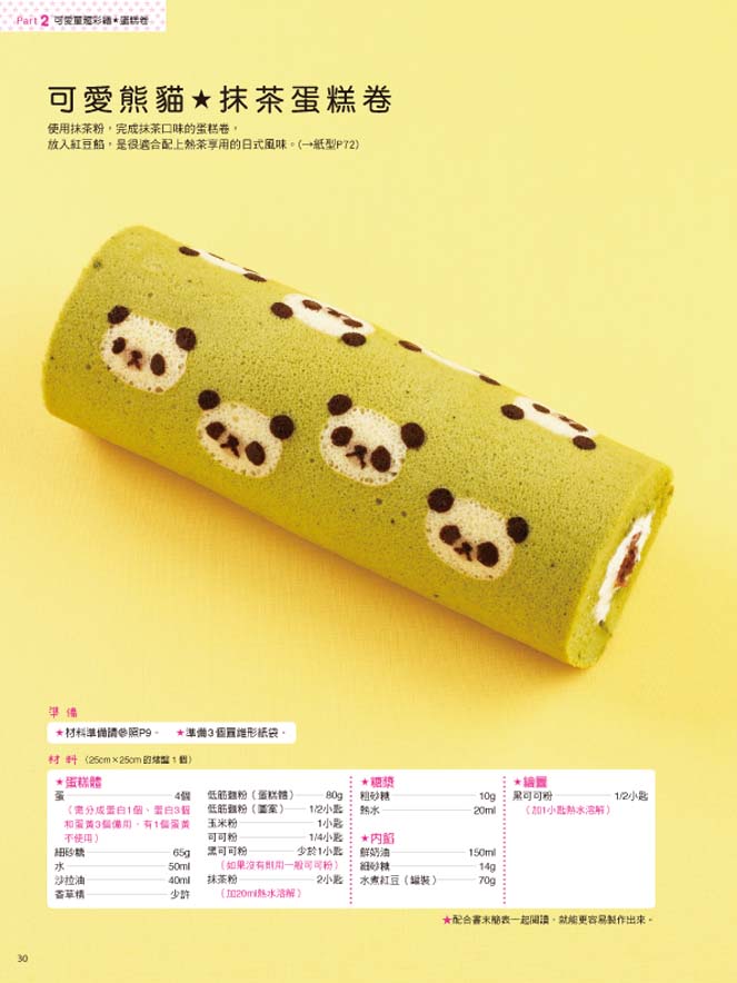 不妨抽空來挑戰看看線條更細緻、色彩更繽紛的人氣圖樣吧!雖然作法較繁複,但是每一種圖案皆附原寸紙型,只要將紙型用剪刀剪下,放到烤盤上,再鋪上烤盤紙,照著圖案描繪即可。不論是正面看、反面看,一樣可愛。即使不擅長畫畫,也能做出相似度百分百的彩繪蛋糕卷喔~