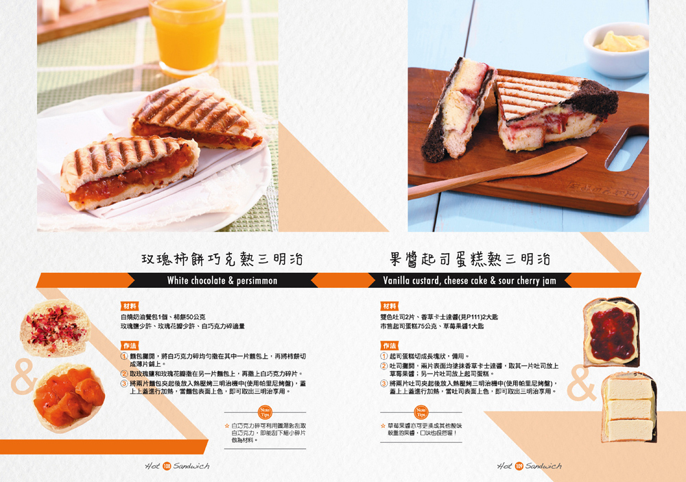 將充滿小麥香的麵包,與清爽的蔬果、彈牙嫩汁的肉類、牽絲的起司、提味的醬料等等甜鹹材料包夾在一起,以機器或平底鍋加熱壓合,讓麵包與餡料的美味巧妙融合,在口中交織揉合出飽滿餡料,熱燙香濃、豐富多彩的食感,令總是冰冷的三明治增添迷人滋味。