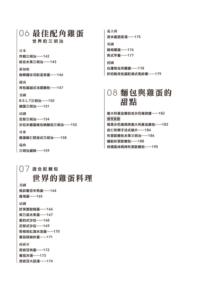 收錄有:透過SNS紅遍世界的馬鈴薯泥半熟蛋、慶祝復活節不可少的魔鬼蛋、法國朝聖勝地聖馬歇爾的名產舒芙蕾歐姆蛋、西班牙家庭料理大蒜湯、近300年前發明的蘇格蘭蛋…….等等。
