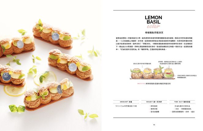 此外,甜點設計需要創意的一切,都藉由直觀的圖像展現出來。如新品的手繪草圖、描述從創意到產品的過程的發想過程圖表,以及清晰顯示產品成分的切面圖。